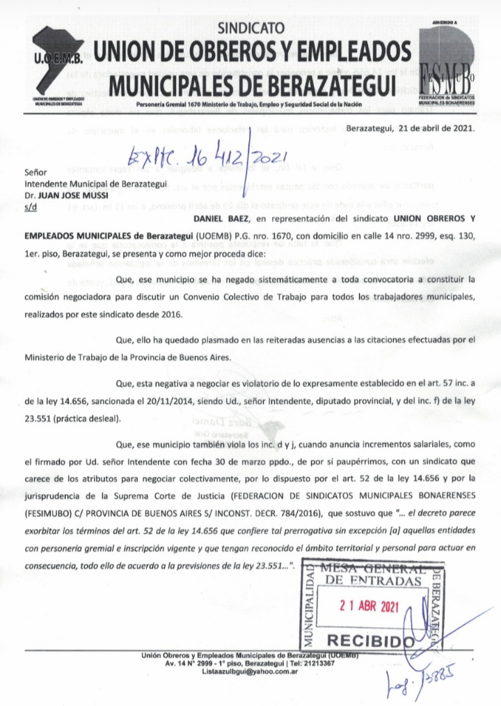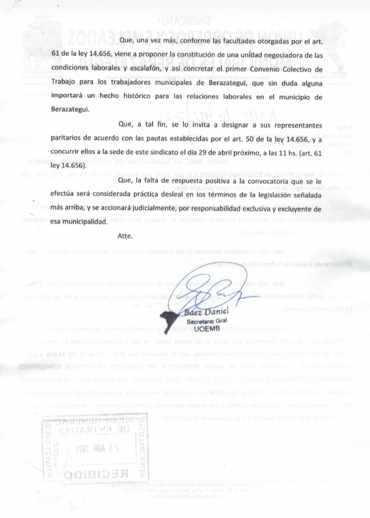 “Hoy presentamos en el municipio el llamado a una nueva convocatoria paritaria para el 29 de abril con el fin de que el Intendente Mussi cumpla la ley sancionada hace seis años. Esta es la tercera o cuarta vez que los convocamos, más todas las efectuadas por parte del Ministerio de Trabajo, y nunca asistió, ni mandó sus representantes. Esto ya tiene otros ribetes y hay que darle una solución, porque queremos como otros municipios nuestro Convenio Colectivo de Trabajo para los trabajadores de Berazategui, y haremos todo a nuestro alcance con acciones directas o por la vía legal para que esto se cumpla”, advirtió el dirigente sindical.