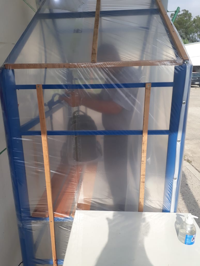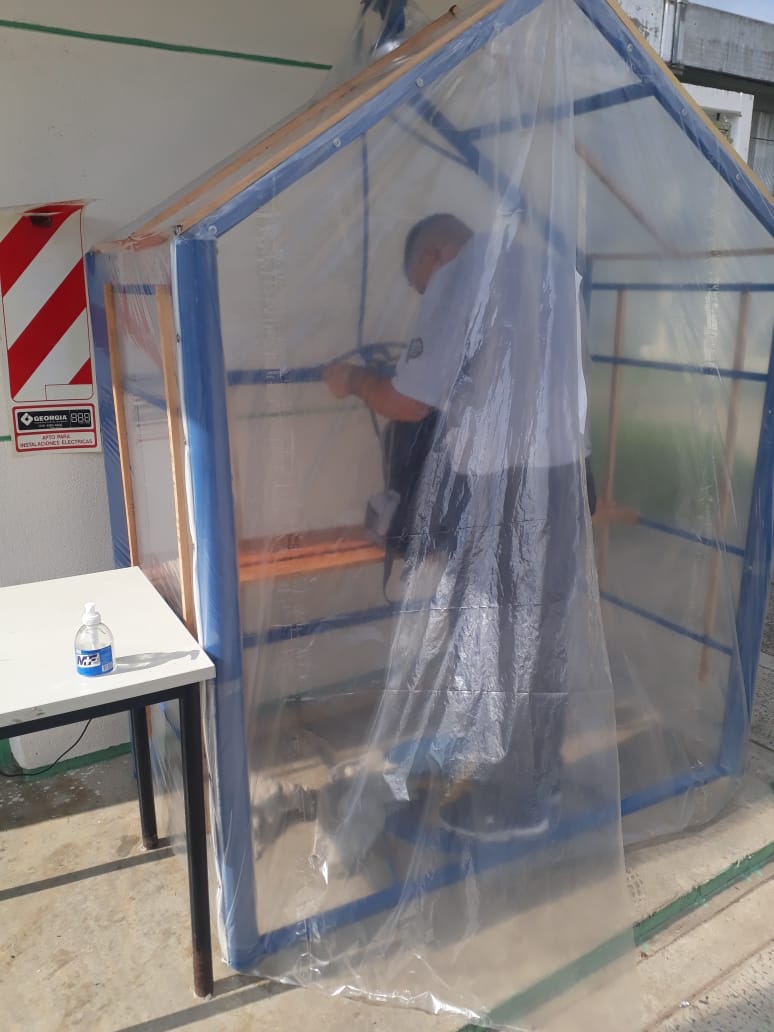 La idea se hizo realidad en pocos días gracias al ingenio y dedicación de 18 internos de la Unidad 42, los que con el apoyo de los agentes penitenciarios y con elementos reciclados construyeron cabinas de desinfección en el taller de herrería.