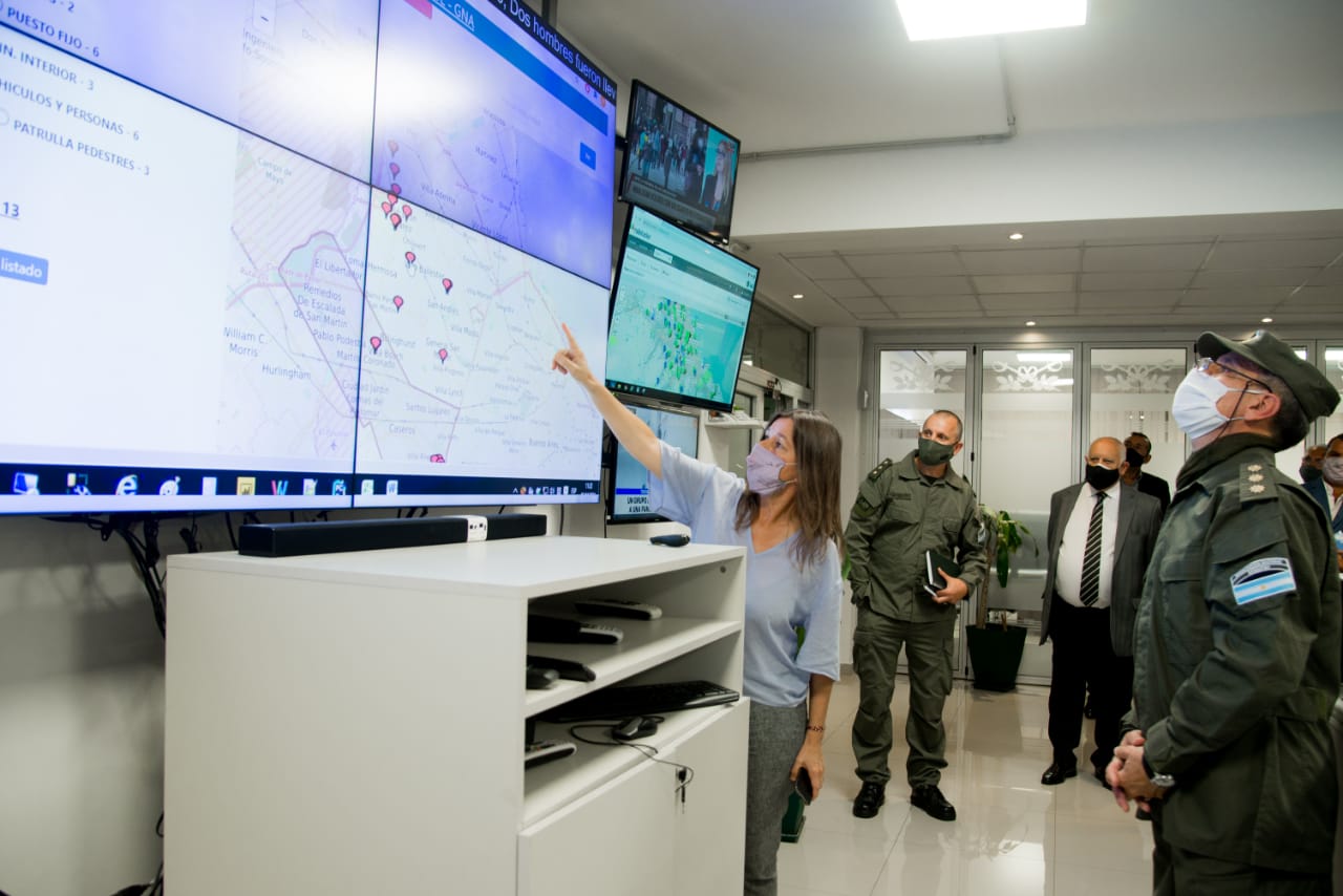 Luego, las y los funcionarios presentes visitaron el Centro de Comando y Control que funciona en el Edificio Centinela, desde donde se visualiza en tiempo real la ubicación y el desplazamiento de las patrullas, el destino asignado (informando qué vehículo es en cada caso, qué tipo de operativo están realizando, etc.) y se identifican los equipos de comunicaciones y la localización desde donde éstos se encuentran operando.