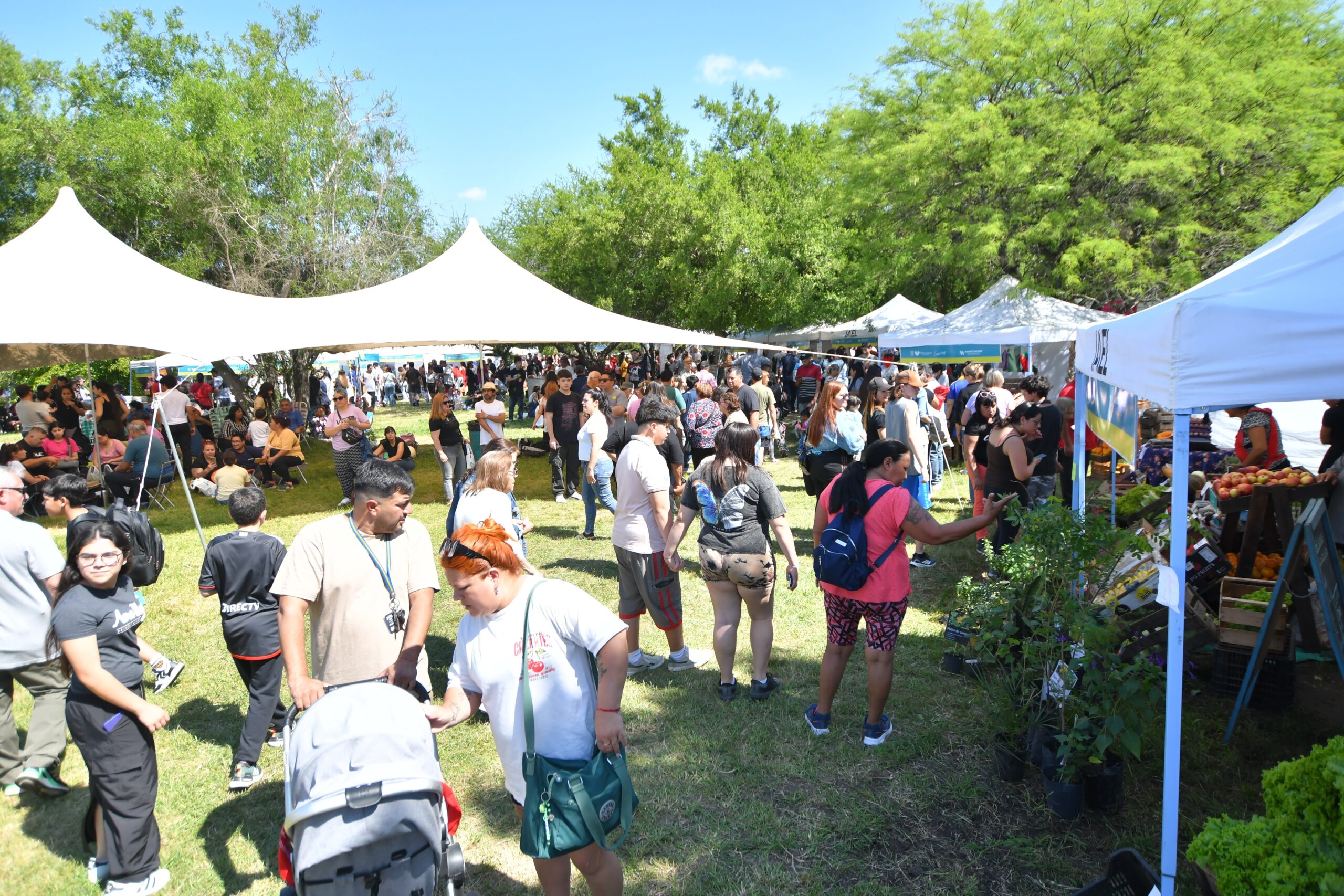 Desde temprano, familias enteras llegaron a la reserva ecológica, algunas en auto, otras en bicicleta o en transporte público. La feria se desplegó entre árboles, puestos de verduras, emprendimientos familiares y el infaltable fruto rojo que simboliza el trabajo del campo varelense.