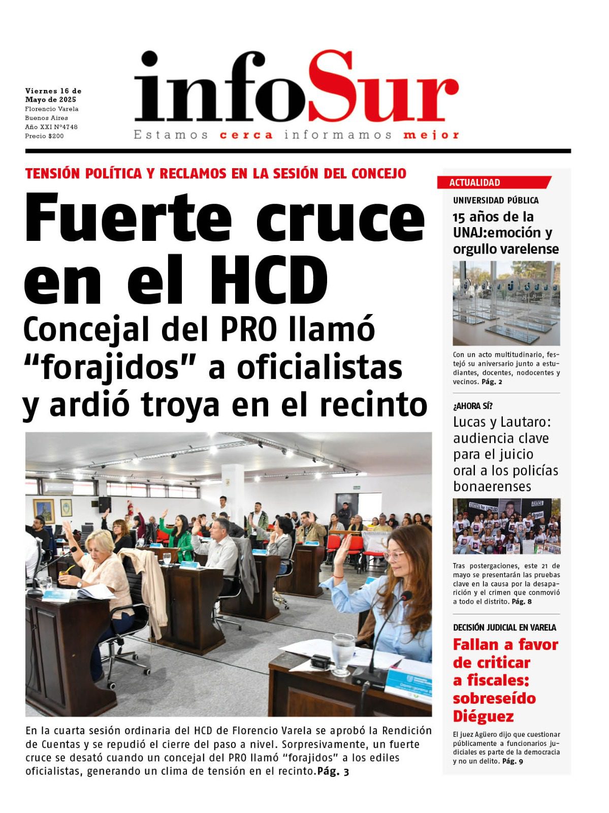 La edición impresa semanal del diario Infosur trae esta semana una batería de noticias esenciales para Florencio Varela y la región, con especial atención a la política local, la justicia y los temas de seguridad. Entre los principales destacados, sobresale el fuerte cruce en el Honorable Concejo Deliberante (HCD), donde un concejal del PRO llamó “forajidos” a sus pares oficialistas, desatando una tensa sesión que no pasó desapercibida.