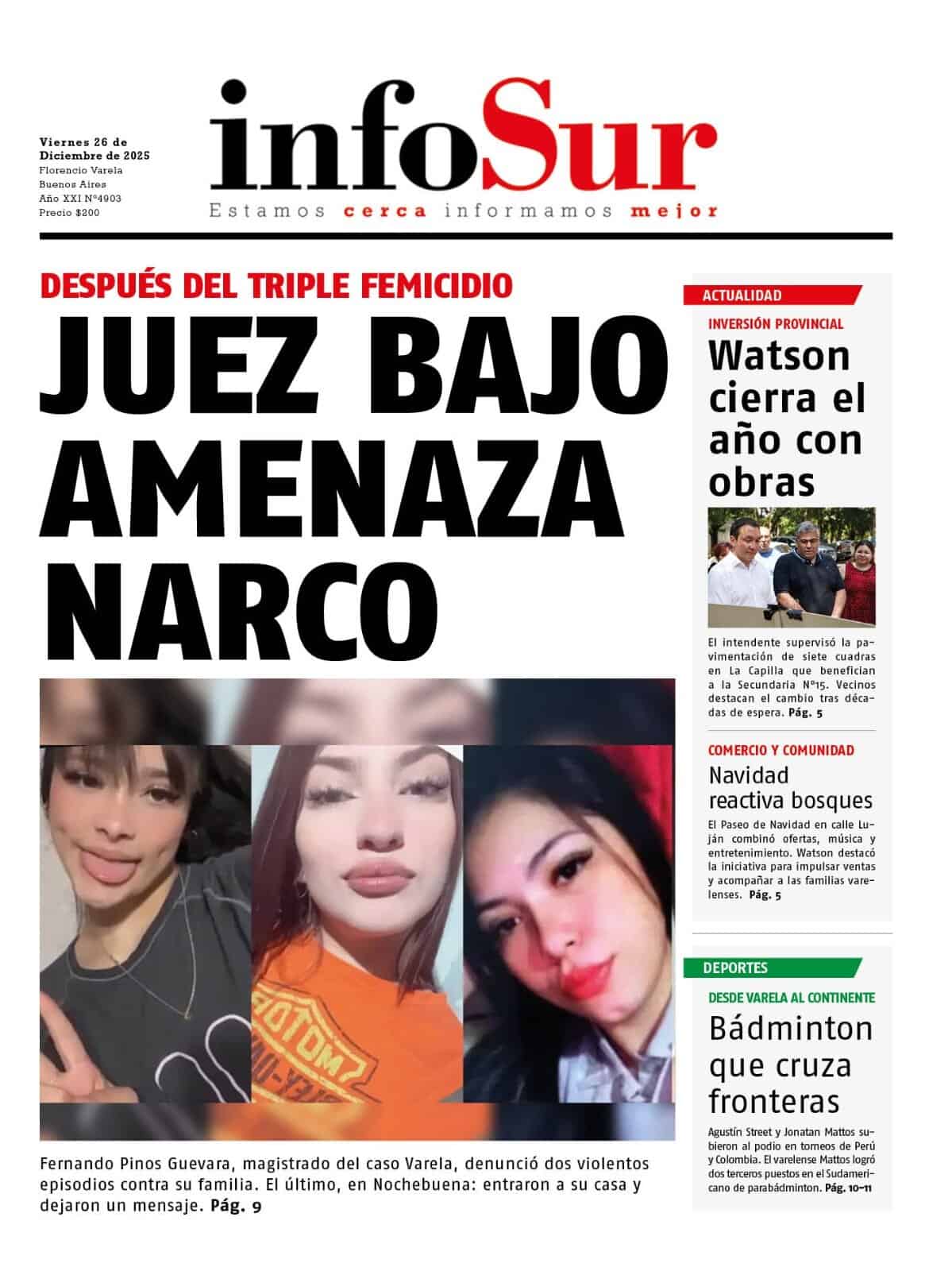 La nueva edición de Infosur revela los detalles del acoso que sufre el magistrado Fernando Pinos Guevara, quien investiga el triple femicidio que sacudió a Florencio Varela. Dos episodios violentos, el último en plena Nochebuena, pusieron en jaque su seguridad y la de su familia.