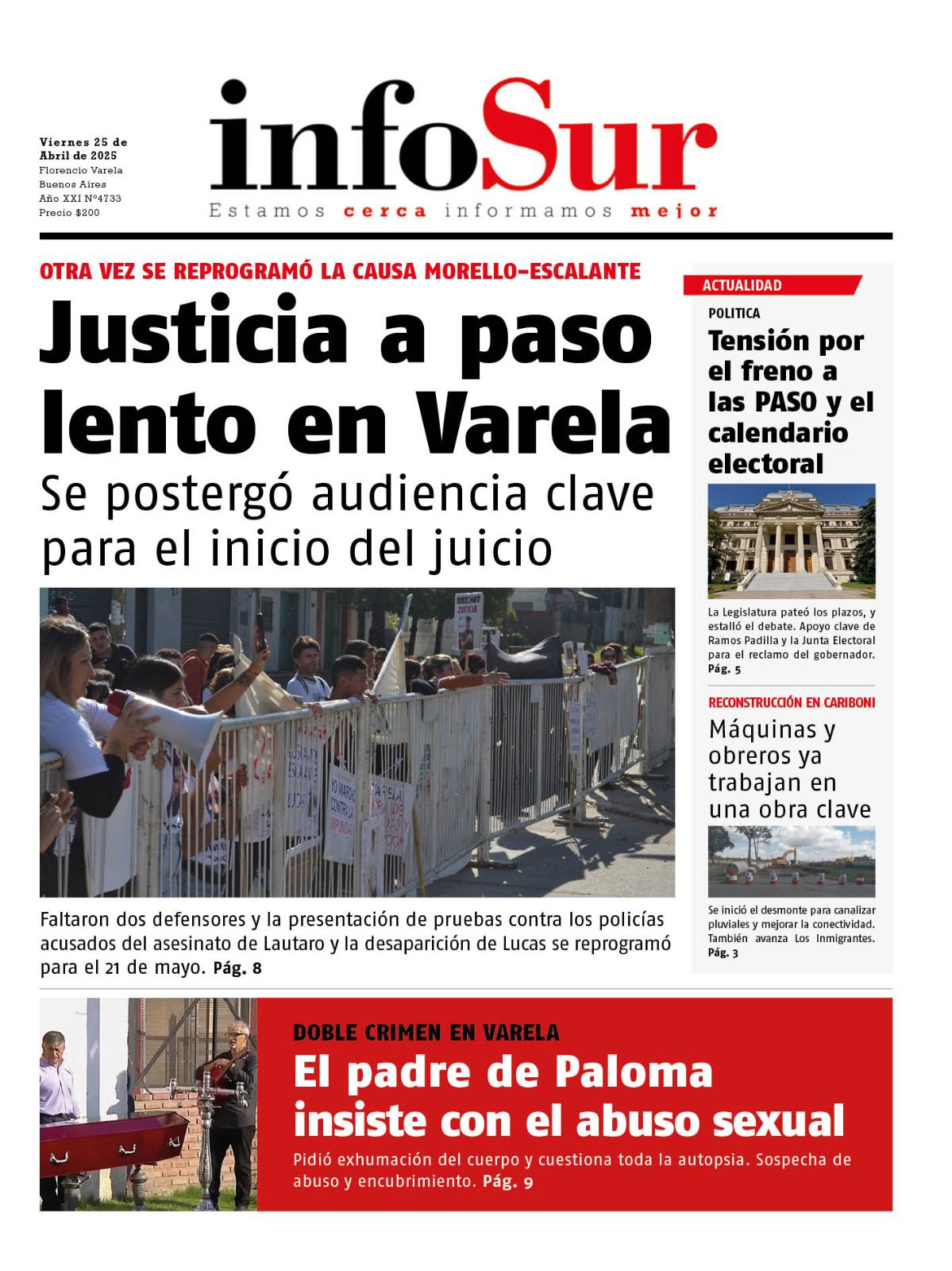 ¿Por qué siempre se demora la Justicia en Florencio Varela? Esa es la pregunta que atraviesa la tapa de la nueva edición impresa de Infosur Diario, con un título tan fuerte como real: “La Justicia de Varela siempre se demora”. Esta semana, los retrasos en el juicio por el brutal crimen de Lautaro Morello y la desaparición de Lucas Escalante vuelven a sacudir a la comunidad.