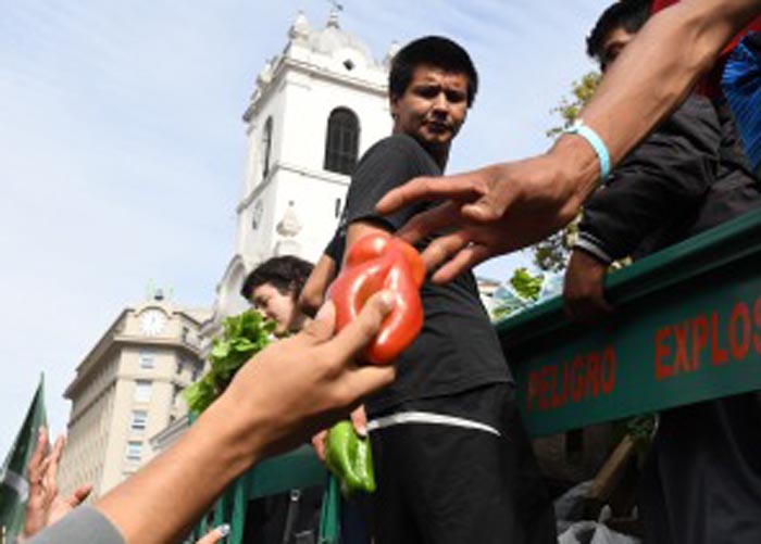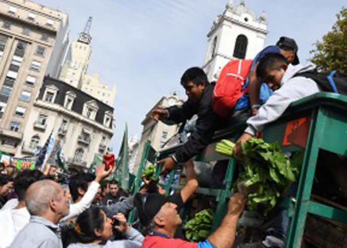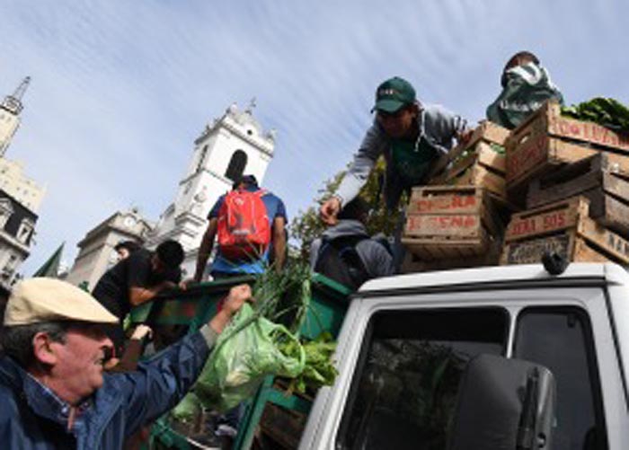 Pequeños productores realizaron hoy en Plaza de Mayo un «verdurazo» para alertar sobre las diferencias de los precios que cobran los productores y los que pagan los consumidores por un mismo producto y reclamar avances en el proyecto de Ley de Acceso a la Tierra.