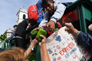 Gente que pasaba y otros que fueron especialmente, personas mayores y algunos con niños, comenzaron a recibir los bolsones de cinco kilos de verduras que entregaban los productores subidos a los tractores, y algunos se expresaban a favor del reclamo.
