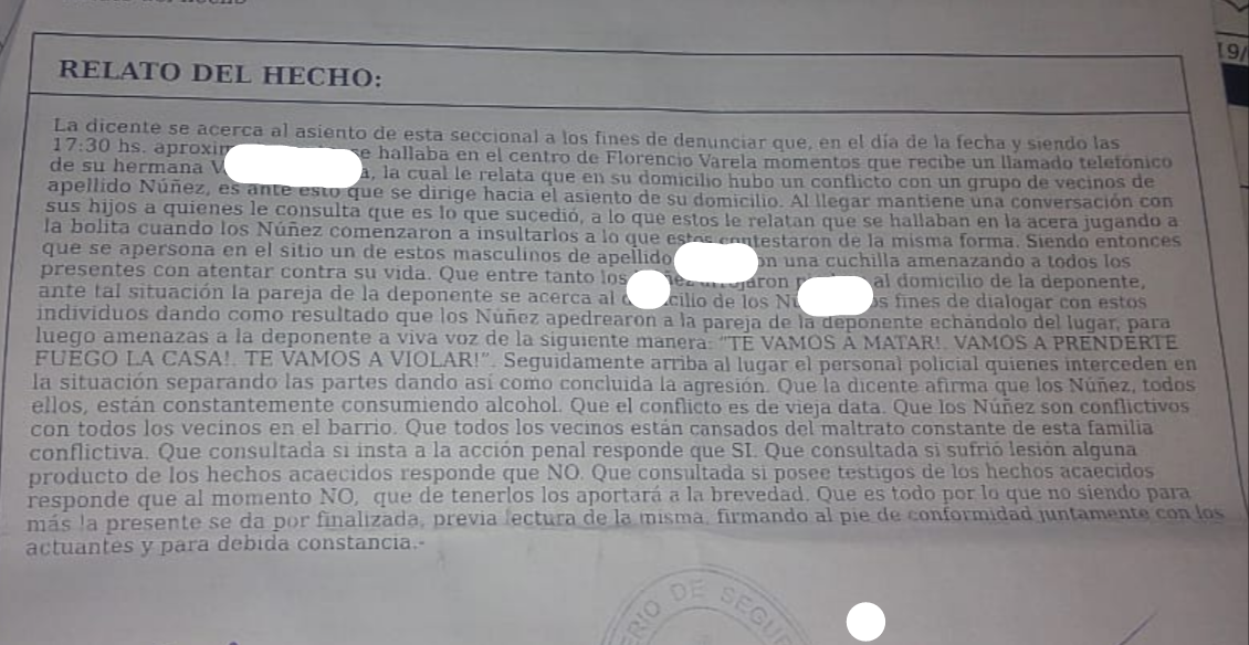 » No podemos salir ni a la vereda» narra la mujer que hace 4 años viene denunciando en la Comisaría Cuarta de Bosques a sus vecinos. » Ellos viven a dos casas de la mia. Nos cascotean la casa, nos insultan, hacen ademanes y me han gritado que van a prender fuego mí casa y violar a mis hijas» cuenta GN desesperada ante la inaccion de la justicia.