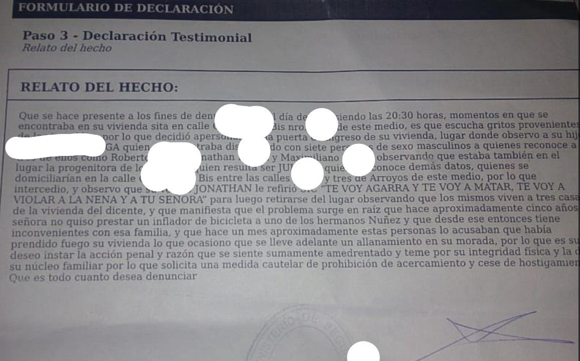 Por otro lado, GN asegura que se acercó a la Fiscalía de Varela y Quilmes dónde recayó la última denuncia. » El abogado que me asesora Dr. Callegari habló ante la fiscalía 11 de Aparicio y le pidió que actúe, que está gente nos va a matar, porque ya nos amenazaron con prende fuego la casa y violarnos. Todavía no recibimos respuesta».