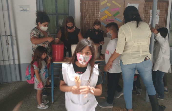 Alumnos de escuelas rurales del Parque Pereyra Iraola recibieron helados de un grupo de policías solidarios que desde hace años llevan adelante actividades en favor de los chicos de la zona. En esta oportunidad se acercaron a la hora de la merienda y les regalaron los postres a los pequeños del nivel primario. Este es un emprendimiento que comenzó años atrás y se replica varias veces al año. Los helados y cucuruchos, fueron donados por un profesional que tiene su local comercial en la localidad de Wilde; en Mitre y Condarco y el apoyo del jefe distrital; comisario inspector, David Pussatti.