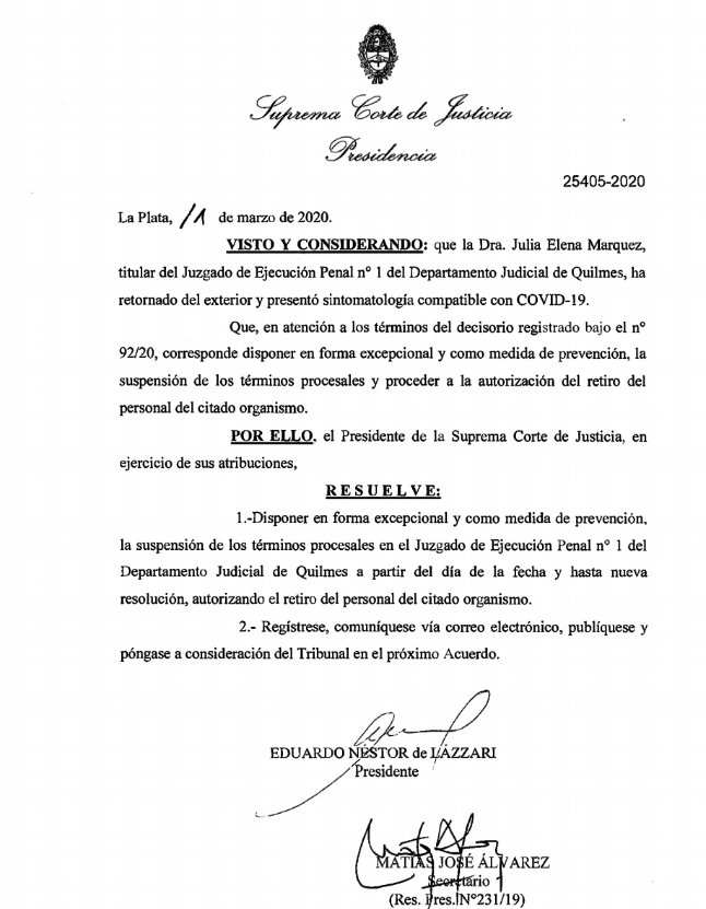 Según cuenta el portal DataJudicial, el mismo se ordenó dado a que la titular del Juzgado de Ejecución Penal 1 de Quilmes, quien llegó semanas atrás de un viaje por el viejo continente habría presentado síntomas de gripe.
