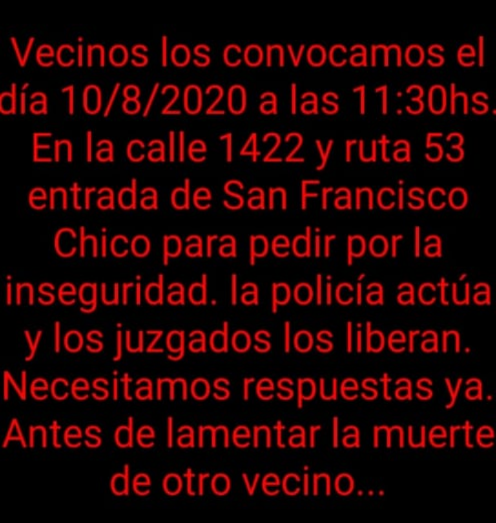 “Parece que están esperando que maten a un vecino o que un vecino mate a un delincuente, para acercarse e intervenir acá” adelantaron en la convocatoria y enviaron un mensaje a las autoridades que se acerquen ese día a la reunión “Si van a venir, les pedimos que traigan propuestas concretas para darnos seguridad. Estamos cansados de promesas, de reuniones, de grupos de vecinos y que todos conozcan quienes no están robando y no hagan nada. Si vienen traigan cosa concretas, sino que no vengan” sentenciaron.