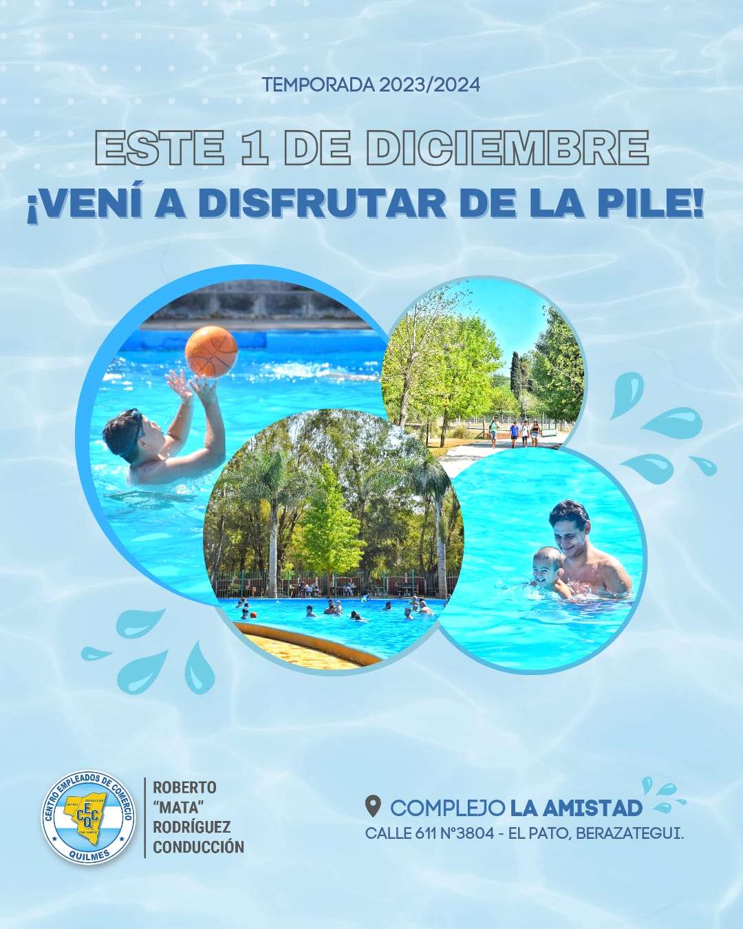El Centro de Empleados de Comercio de Quilmes, Berazategui, Fcio. Varela y S. F. Solano, se alegra en informar que el próximo viernes 1 de diciembre de 2023 se dará inicio a la temporada de pileta en el Complejo Recreativo La Amistad, ubicado en la localidad de El Pato, Berazategui.