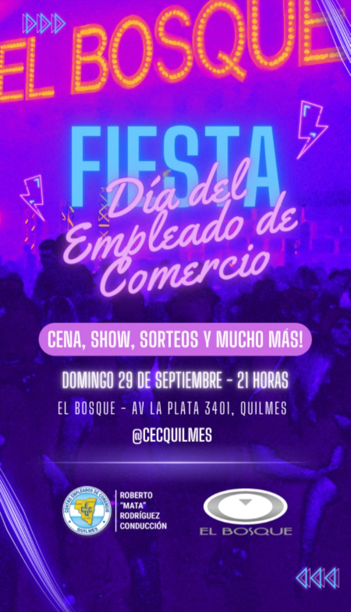 La Comisión Directiva del Centro de Empleados de Comercio de Quilmes, Berazategui, Fcio. Varela y S. F. Solano, que conduce Roberto “Mata” Rodríguez, se alegra en informar a todos sus afiliados que, como ya es costumbre, se realizará nuevamente la celebración por el Día del Empleado de Comercio en el famoso boliche bailable “El Bosque”, de la ciudad de Quilmes.