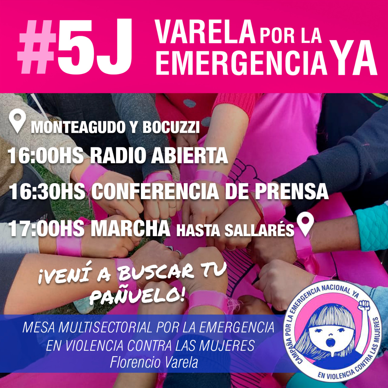La Mesa Multisectorial por la Emergencia en Violencia Contra las Mujeres, Fcio Varela realizará este miércoles 5 de Junio, 16.30 hs una conferencia de Prensa en la peatonal, Monteagudo y Bocuzzi. Allí darán datos sobre los índices de violencia contra la mujer en el distrito.