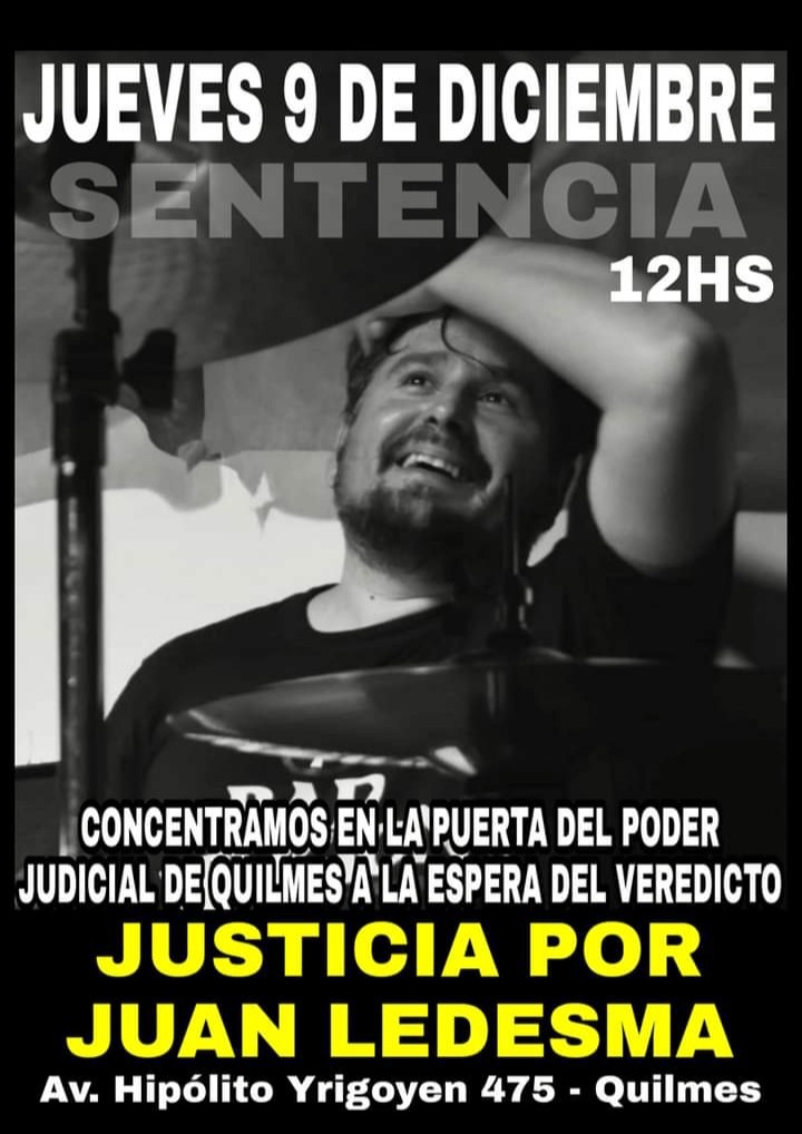 Desde las 12 del mediodía del Tribunal Oral N° 4 de Quilmes darán lectura al veredicto contra Cristian Genez y Yésica Buenahora por el crimen del baterista de la banda Súperuva Juan Ledesma asesinado a la salida de una presentación en Febrero de 2018 en Quilmes.